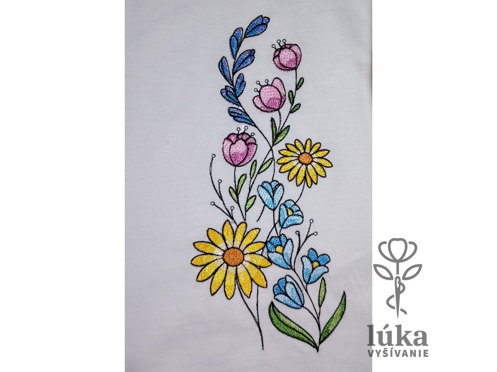 Biele bavlnené vyšívané tričko spája čistý štýl s pestrou krásou lúčnych kvetov. Obľubujú ho milovníčky prírody a originálnej, tradične ladenej módy.