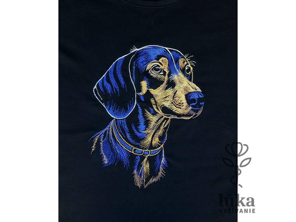 Elegantná, umelecky spracovaná výšivka jazvečíka v kontrastných modro-zlatých tónoch na čiernom podklade pôsobí veľmi luxusne a umelecky.