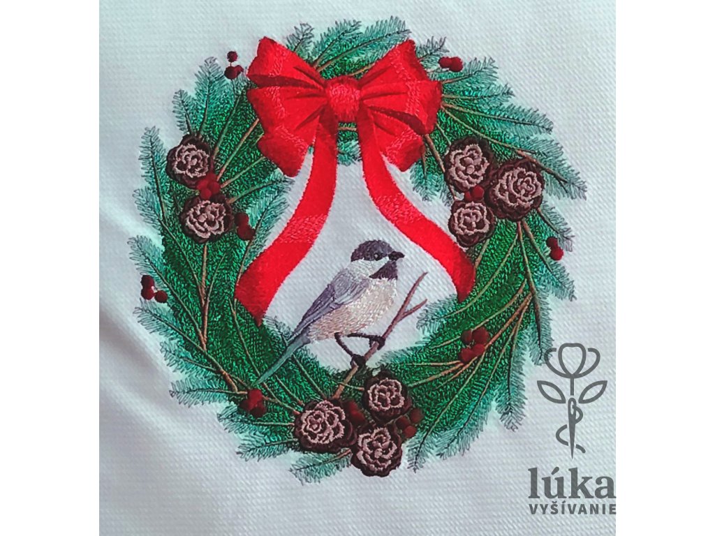 Ručne vyšívaný vankúš s precíznymi detailmi a bohatým tieňovaním. Vtáčik v ihličnatom venci Vám zaspieva na vianočnú nôtu.