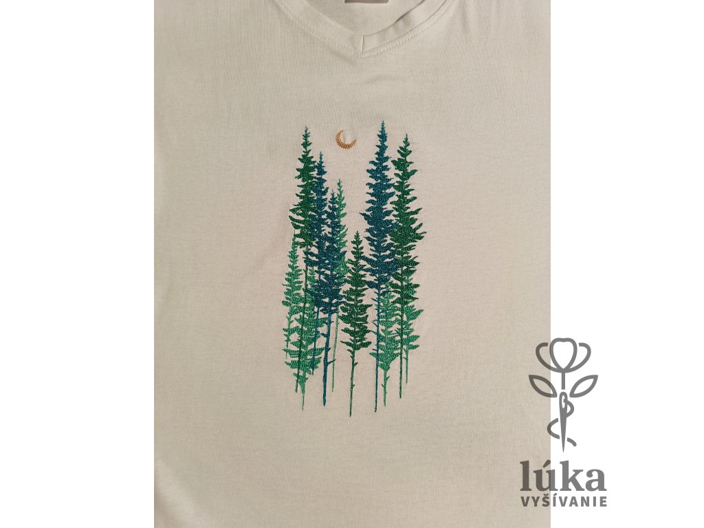 Kúsok horskej prírody vo forme elegantnej výšivky ihličnanov v odtieňoch smaragdovej a tyrkysovej pod jemným zlatým mesiacom. Kvalitné biele tričko s V-výstrihom pre milovníkov čistého dizajnu.