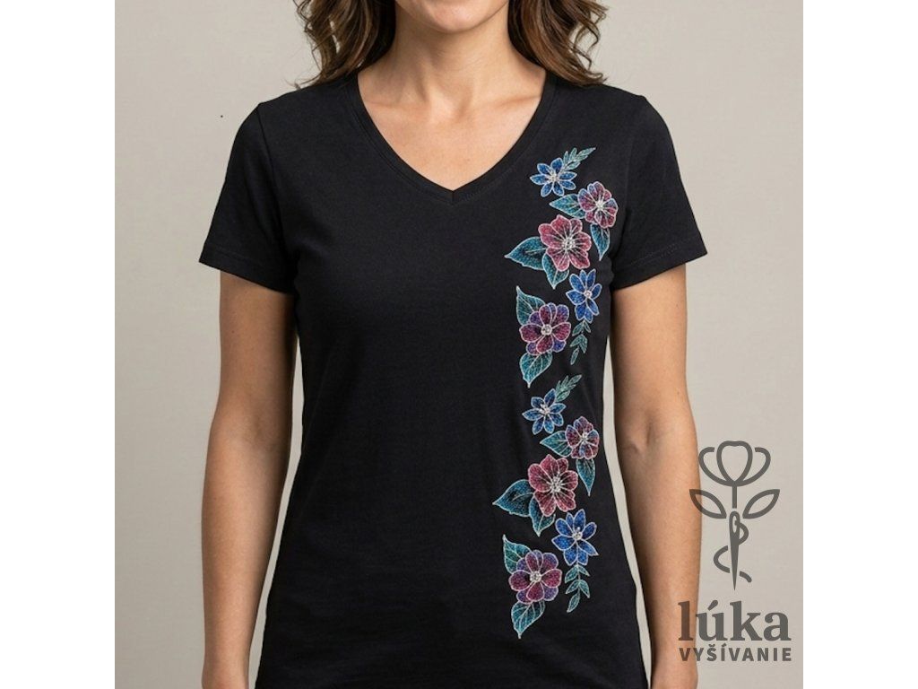 Doprajte si kúsok, ktorý v sebe spája hĺbku noci a jemnosť lúčnych kvetov. Naše tričko Kvety na čiernom je navrhnuté pre ženy, ktoré hľadajú niečo viac než len módu. Dominantná umelecká výšivka v harmonických odtieňoch fialovej a tyrkysovej vytvára na tmavom podklade luxusný kontrast, ktorý pritiahne každý pohľad.