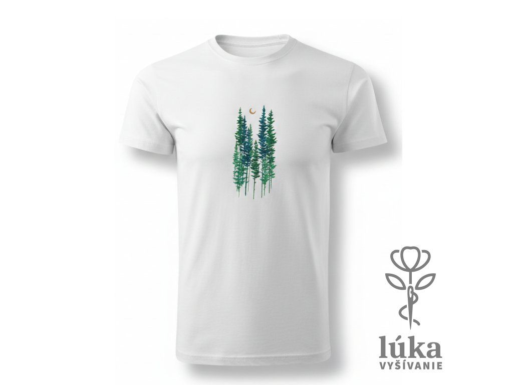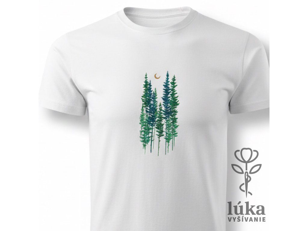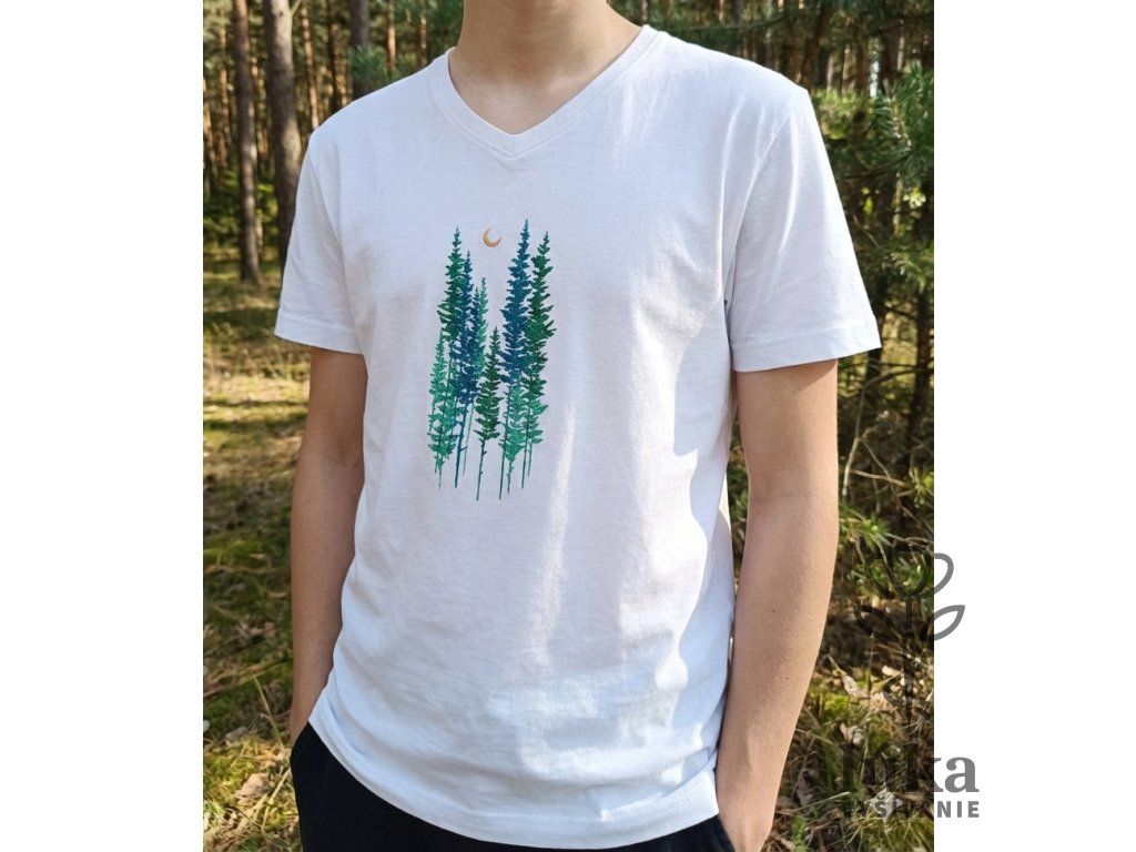 Kúsok horskej prírody vo forme elegantnej výšivky ihličnanov v odtieňoch smaragdovej a tyrkysovej pod jemným zlatým mesiacom. Kvalitné biele tričko s V-výstrihom pre milovníkov čistého dizajnu.