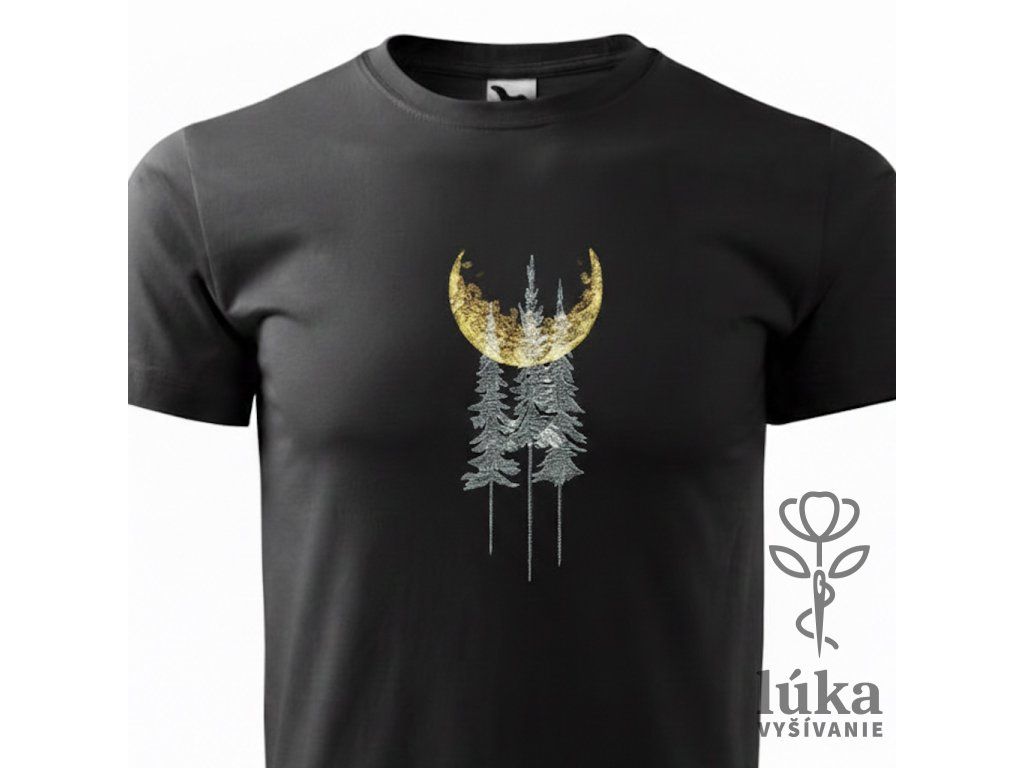 Čierne tričko s precíznou výšivkou zlatého mesiaca a strieborných siluet lesa pre milovníkov mesačnej noci.